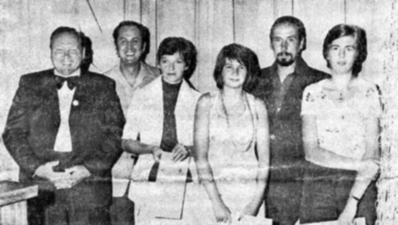DER BOGENCLUB Babenhausen richtete die Kreismeisterschaften 1975 aus. Unser Foto zeigt von links den Ersten Vorsitzenden Gerhard Rudolf und die Kreismeister Norbert Urban, Ingrid Mickel, Norbert Plängsken, Alfred Stenger (alle Babenhausen), Rainer Sauerwein, Schaafheim. (Siehe auch Bericht.) Bild: Mahr