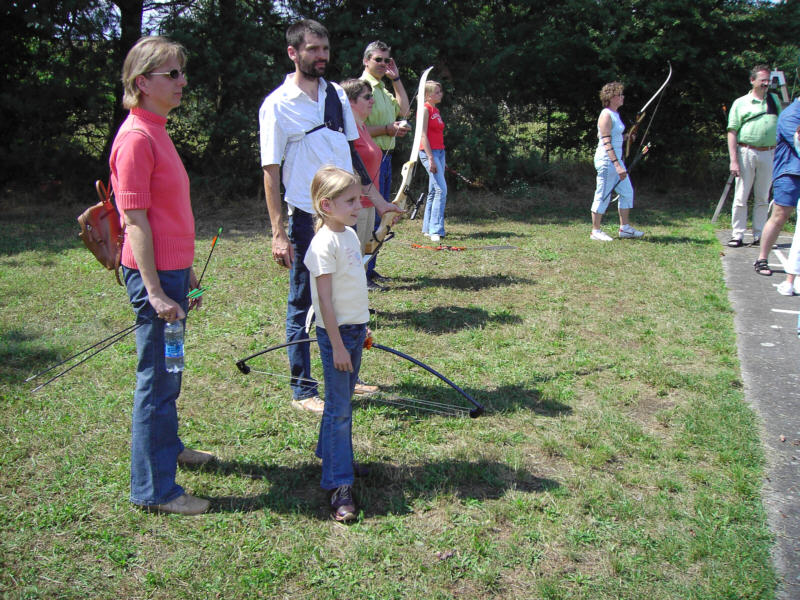 Am Sonntag, dem 10.07.05 traf sich die Kolpingfamilie, um mit Kindern und Fahrrädern entlang der Gersprenz nach Babenhausen zu strampeln. Tolles Wetter bis kurz vor Babenhausen. Dann ging's heftig zur Sache: Innerhalb kürzester Zeit waren alle trotz Friesennerze durchnässt. Auch das Strickjäckchen von J. verlor. Zum Glück war es nicht mehr weit zum Ristorante, das uns vor offizieller öffnungszeit Schutz gewährte. Nach Genüssen aus der italienischen Küche wechselte das Wetter so schnell, dass alle gerade Getrockneten sofort wieder (schweiss)nass wurden. Nach einer Stadtrundfahrt und über Harreshausen ging es zum Bogenschützenclub Babenhausen, wo Kolpingbruder Roland uns in eine sehr gepflegte Anlage führte, indem er auch der 2. Vorsitzende ist.