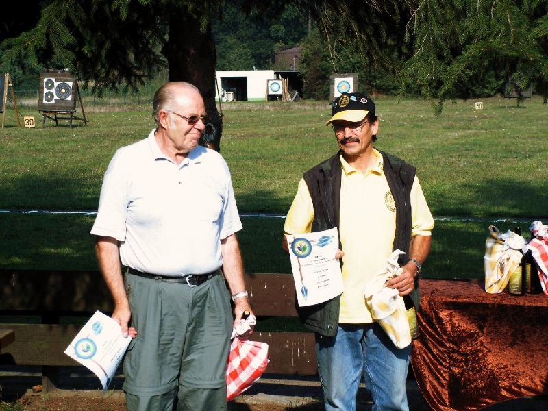 Walter Flach, Jahrgang 38, konnte als ältester aktiver Schütze im Verein über einen erfolgreichen Start eine Woche vorher beim Magstädter Arrowheadturnier berichten. 10. Platz in der Schützenklasse (keine Altersunterscheidung) der Feldbogenschützen mit 201 Ringen und wurde mit dem grünen FITA-Arrowhead-Abzeichen ausgezeichnet.